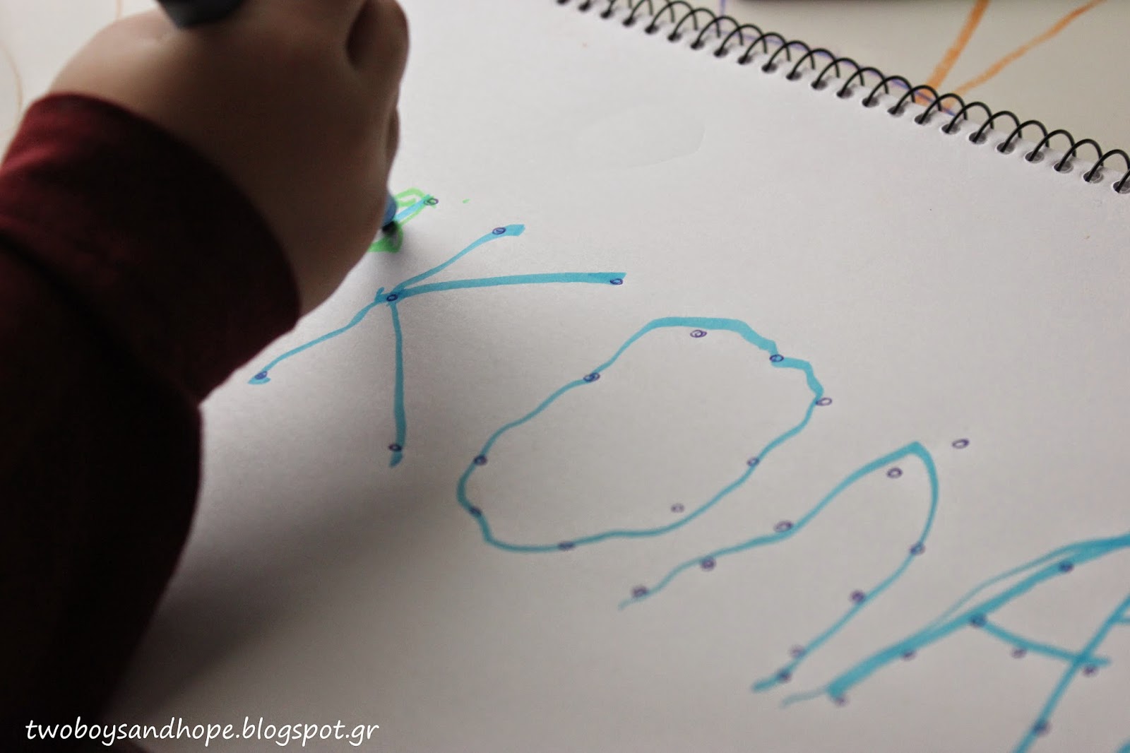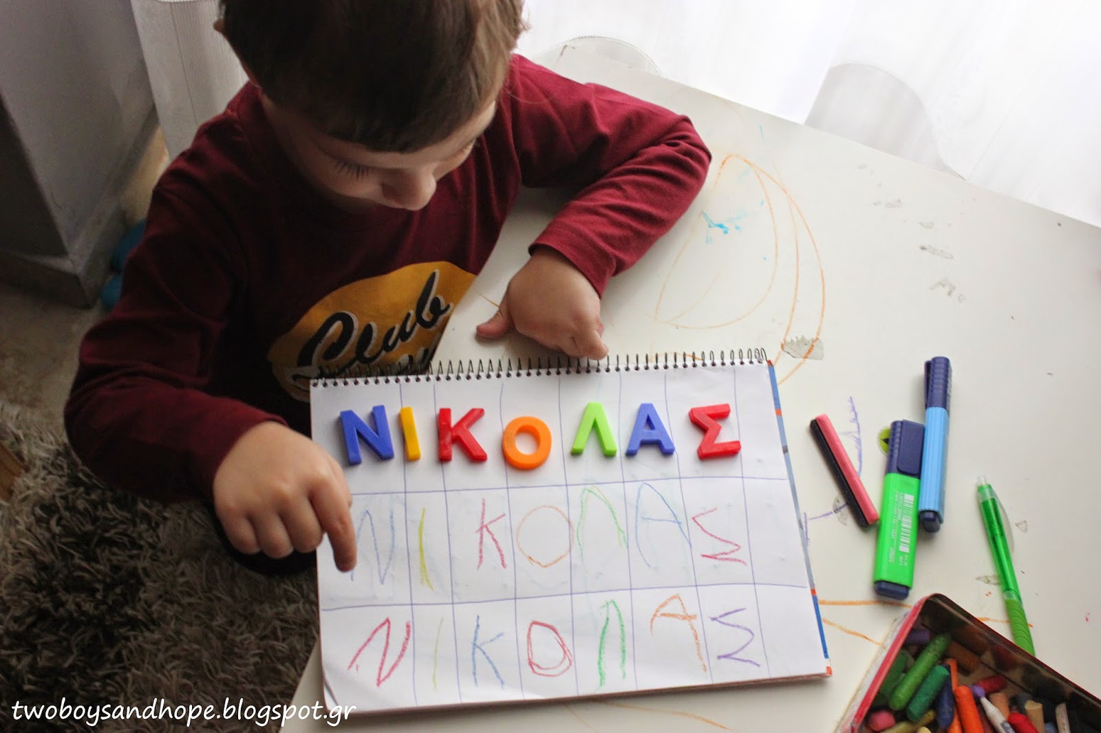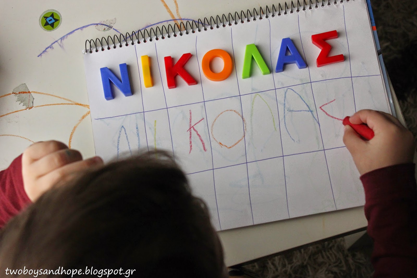 Σε ευχαριστω για την καταπληκτική ιδεα! Η κόρη μου 4 ετων ενθουσιάστηκε απιστευτα αν και ήξερε ηδη να γράφει το όνομα της και έτσι έμαθε να γράφει της αδερφουλας της, του Μπάμπα και της Μάμας! Σε διαβάζω Κάιρο και θαυμαζω τον κόπο και την προσπαθεια σου για την ανατροφή του Νικολα! Σκέφτομαι να μπω στην blogoπαρεα με το δικο μου blog, μήπως μπορείς να μου πεις πως φτιάχνεται ενα blog; Ευχαριστώ..