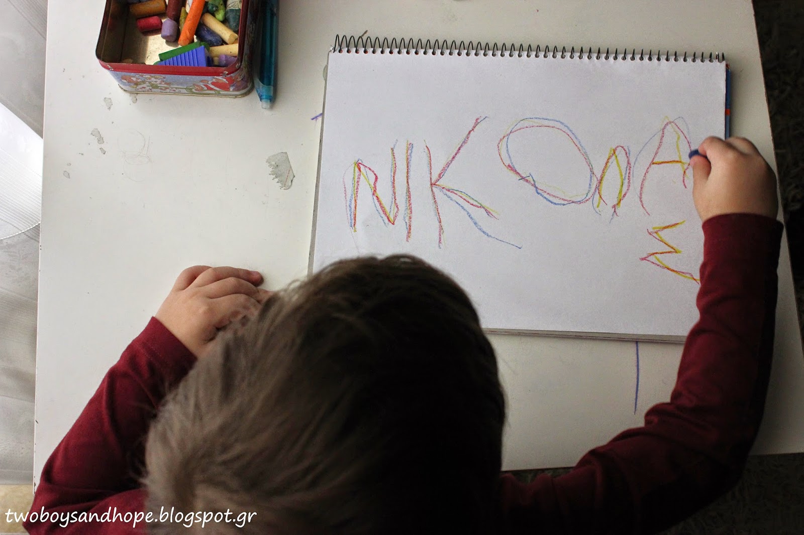 Καλή αρχή στην γραφή σας και εύχομαι σύντομα ο Νικόλας να γράφει χωρίς βοήθεια. Μα πόσο υπέροχοι οι τρόποι της εκπαίδευσης του…ένα ατελείωτο παιχνίδι μάθησης! Εύγε Ελπίδα μου 🙂