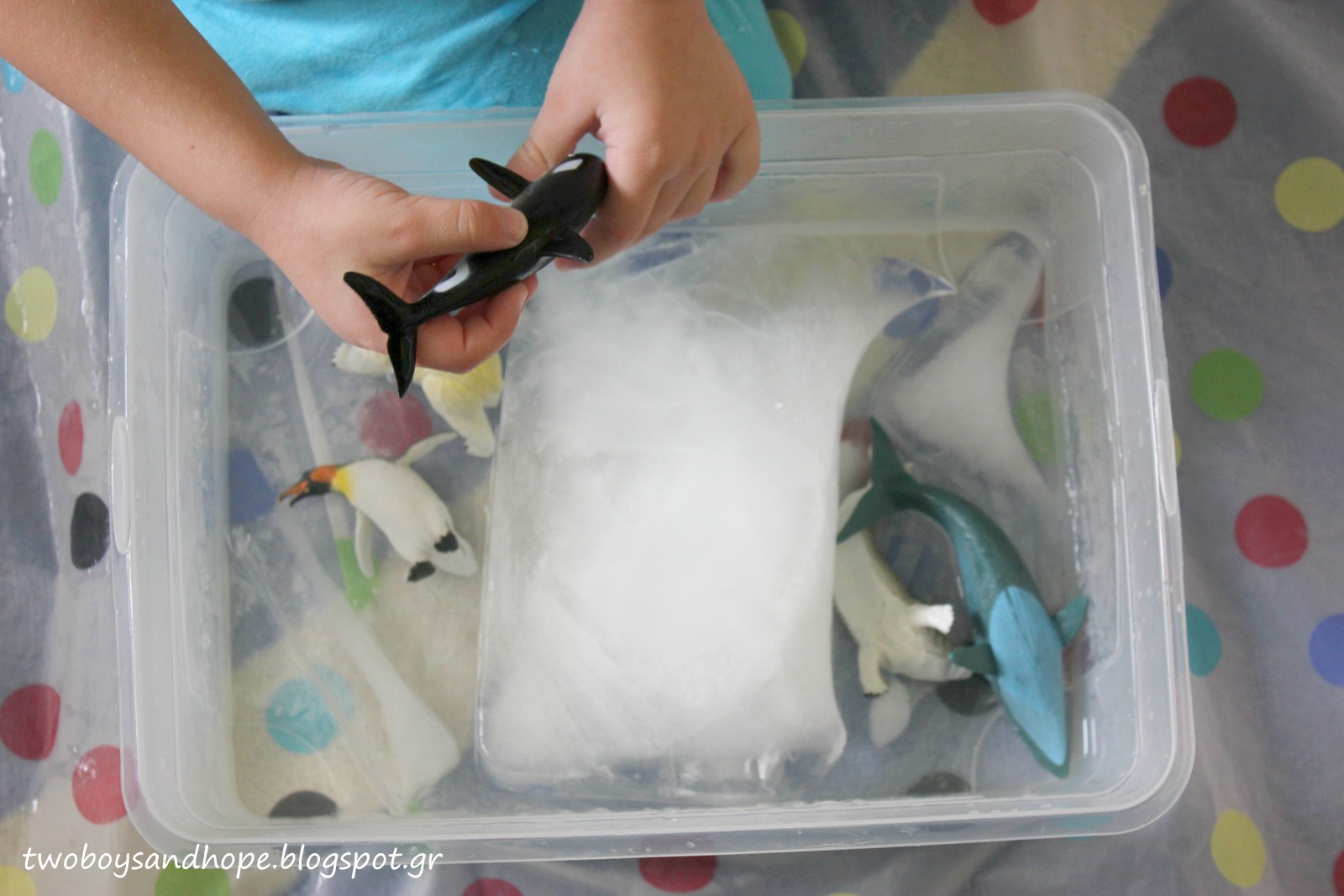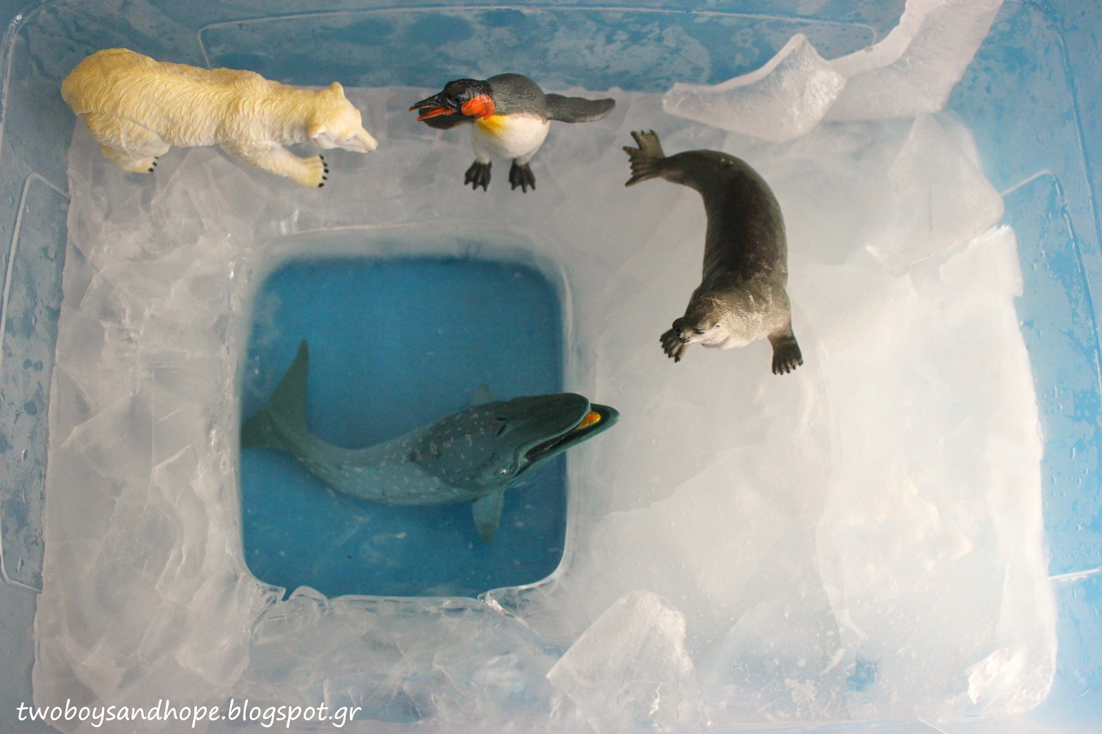 Βάζουμε μέσα τα πλαστικά ζωάκια.. γεμίζουμε την τρύπα με ζεστό νερό.. (ο πάγος θα αρχίσει να τρίζει και να σπάει..) και πάμε για παιχνίδι..
