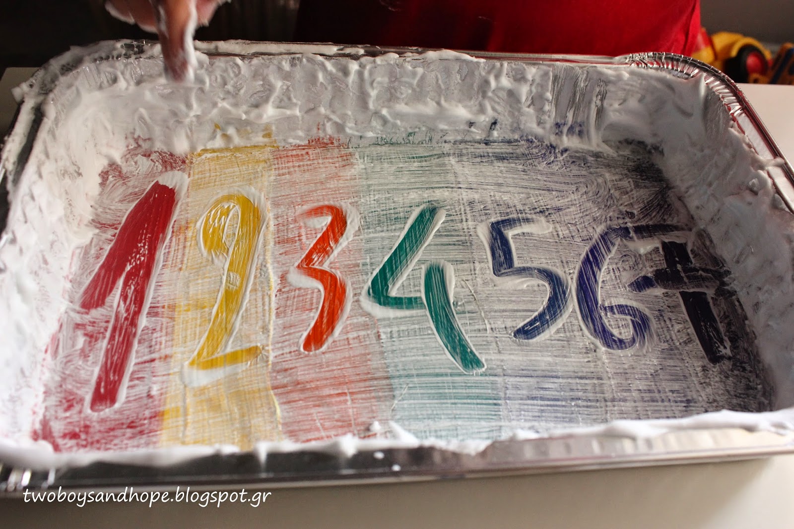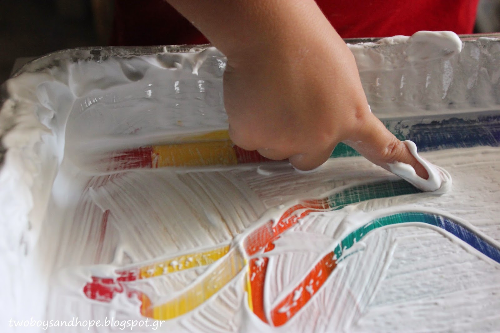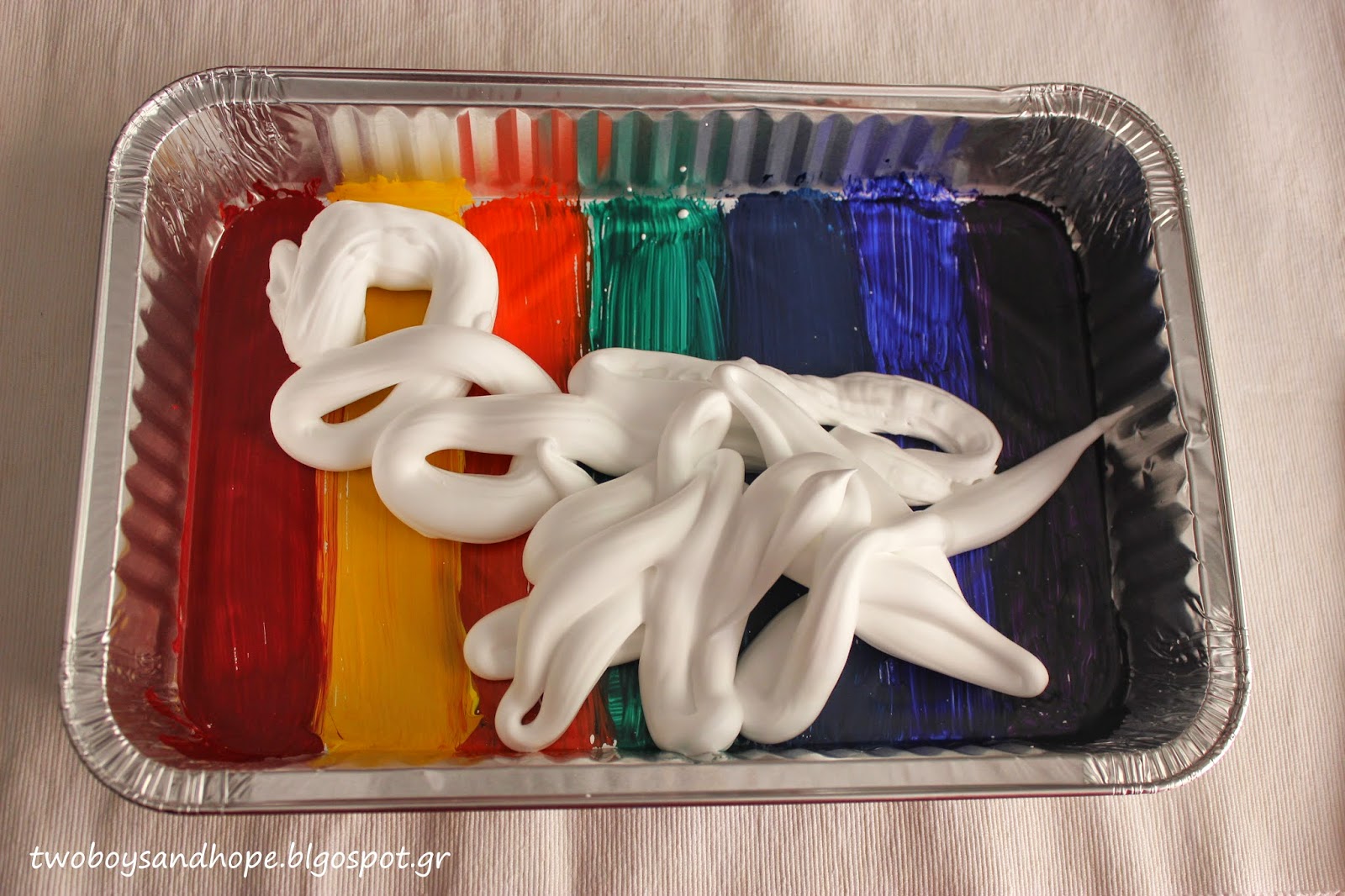 Τέλειο!!! Και ίσως μπορούμε αντί για αφρό να γεμίσουμε το ταψί αλεύρι η και τέτοιο ώστε με το δάχτυλο να γίνονται γραμμές και να φαίνεται το ουρανό τόξο…