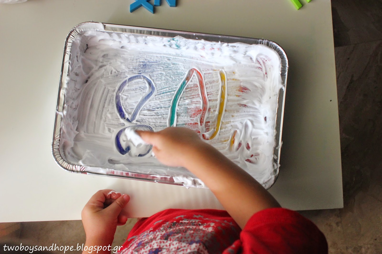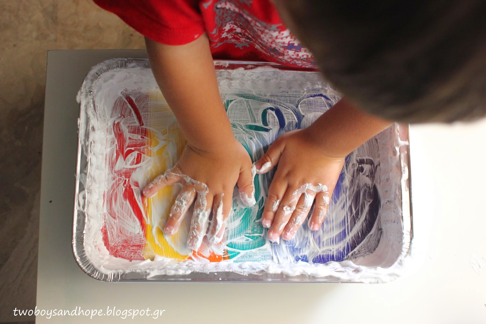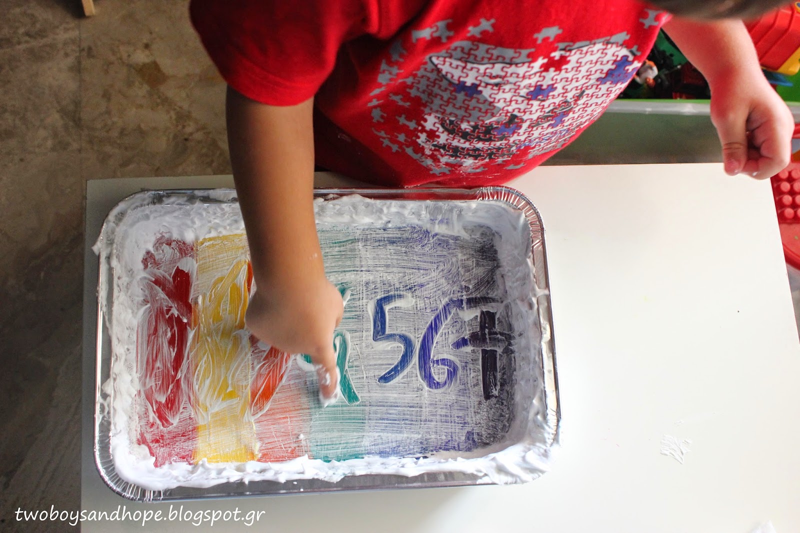 Τέλειο!!! Και ίσως μπορούμε αντί για αφρό να γεμίσουμε το ταψί αλεύρι η και τέτοιο ώστε με το δάχτυλο να γίνονται γραμμές και να φαίνεται το ουρανό τόξο…
