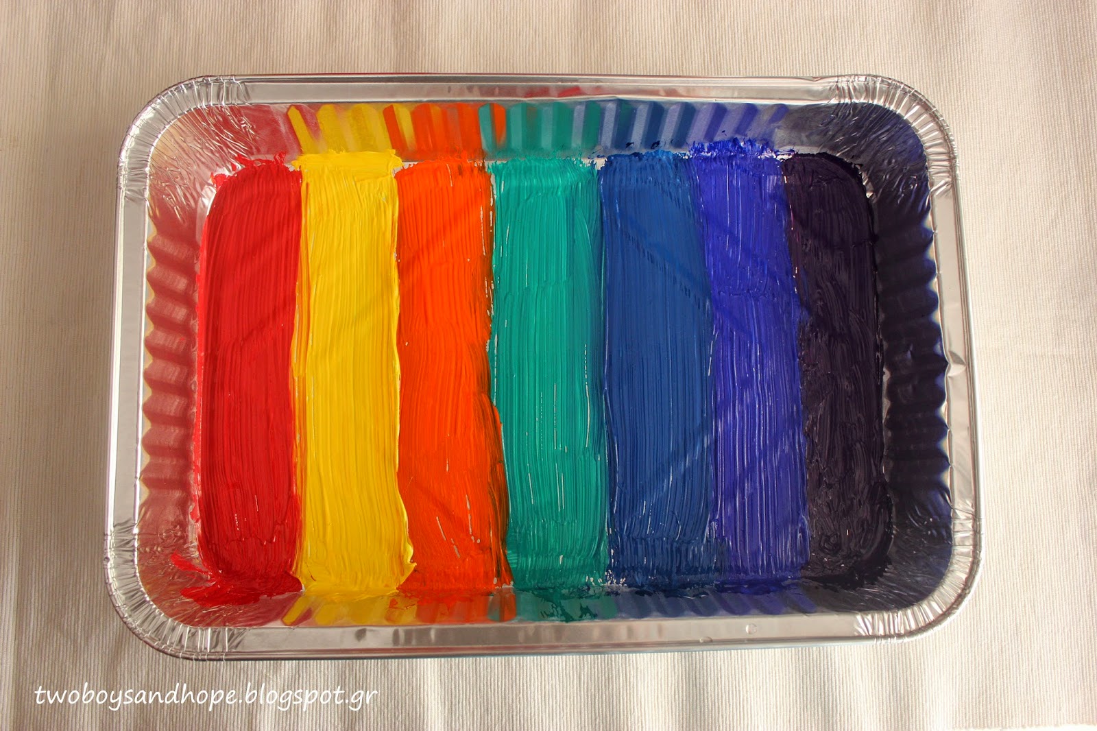 Με το πινέλο χρωματίζουμε λωρίδες (ή κύκλους, τετράγωνα ή ότι άλλο θέλουμε…) στα χρώματα του ουράνιου τόξου (ή όποια χρώματα θέλουμε, έχουμε..) στο αλουμινένιο ταψάκι.