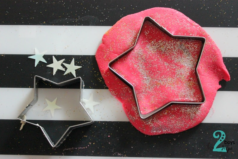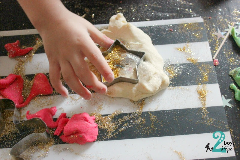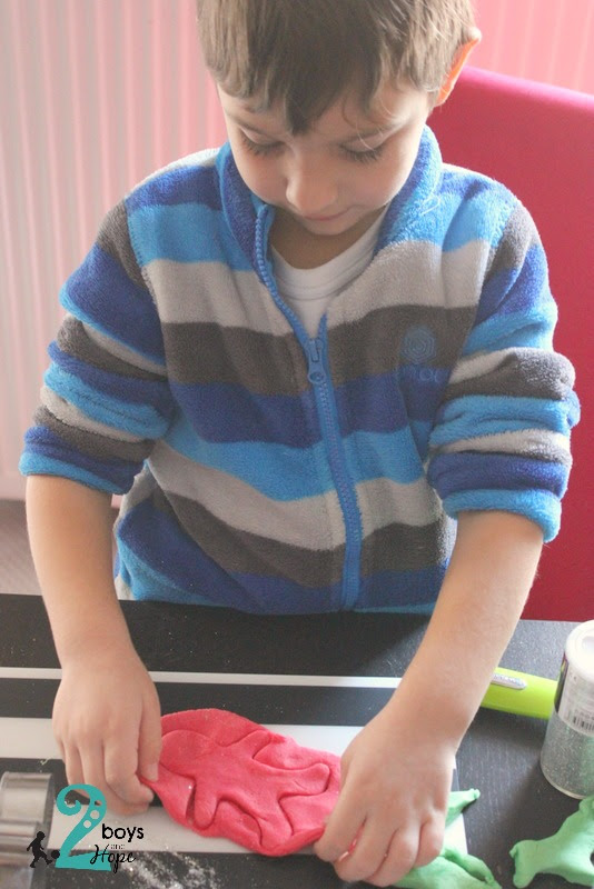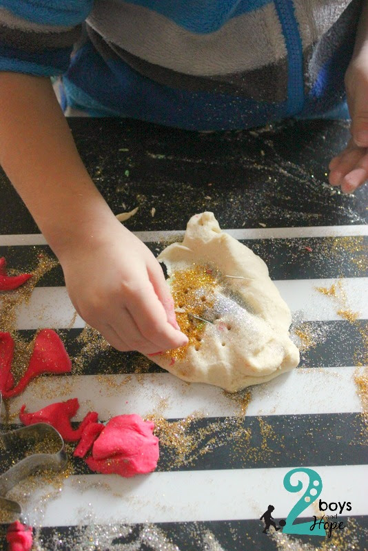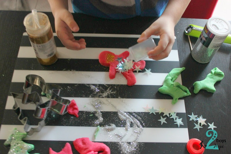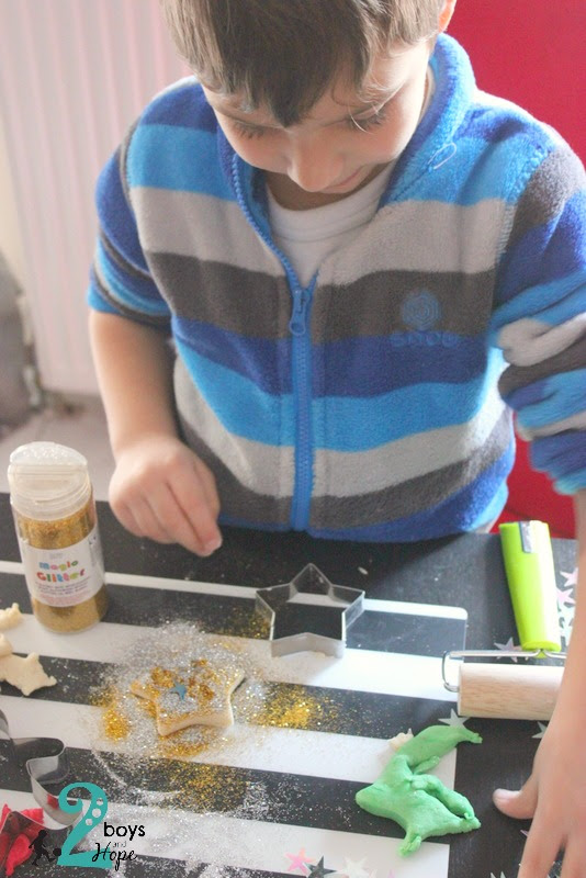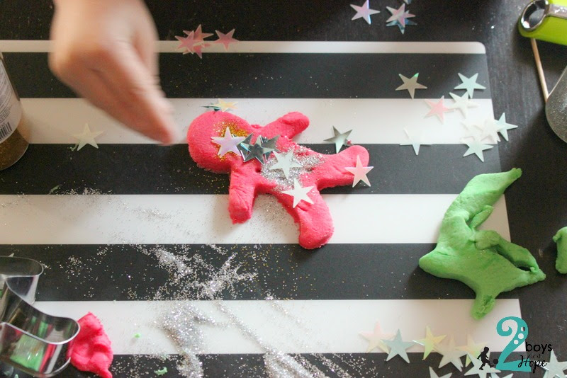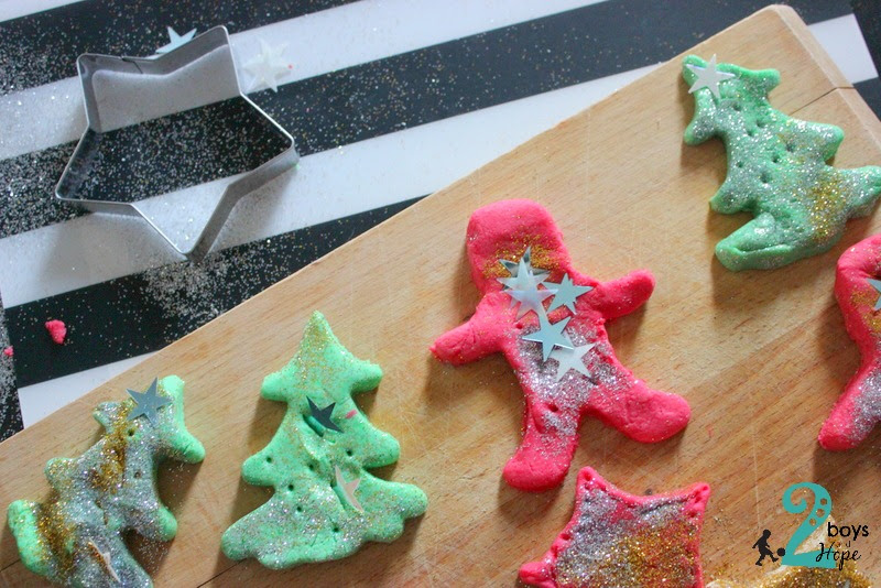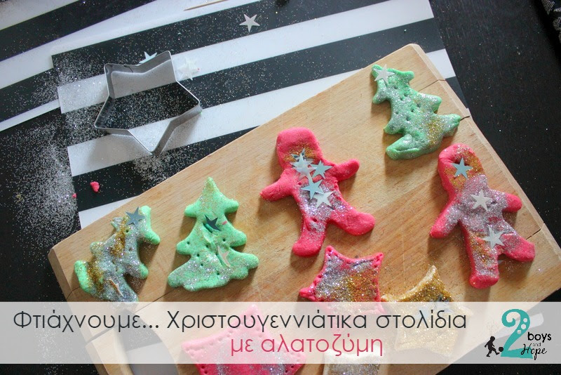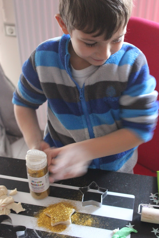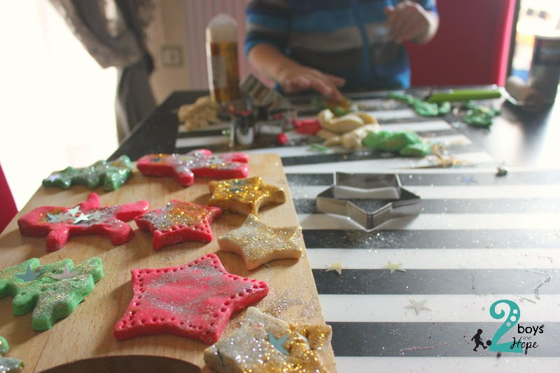 Απλώσαμε στο τραπέζι την αλατοζύμη.. οδοντογλυφίδες, ένα μίνι πλάστη, αστεράκια, γκλίτερ και χριστουγεννιάτικα κουπάτ και αρχίσαμε να φτιάχνουμε..