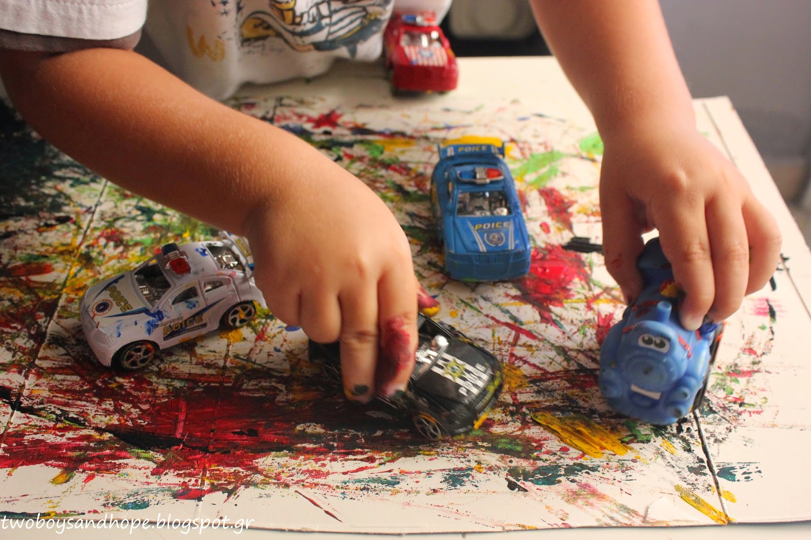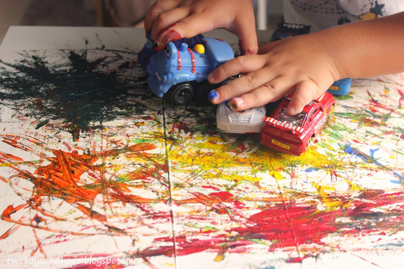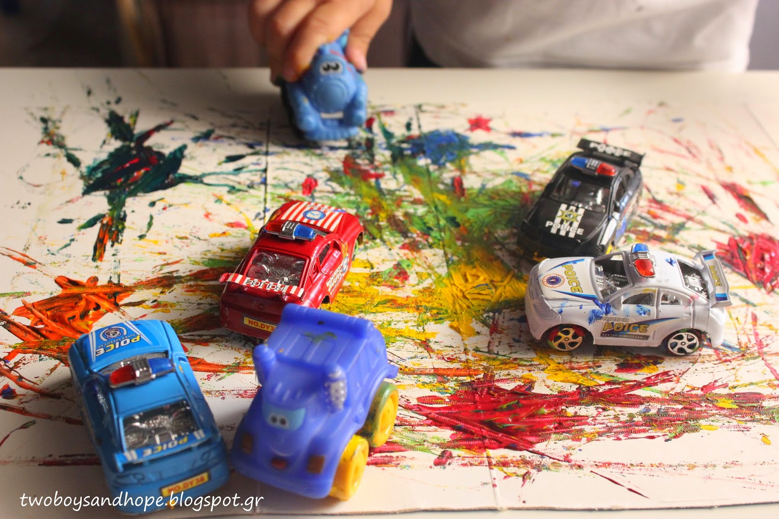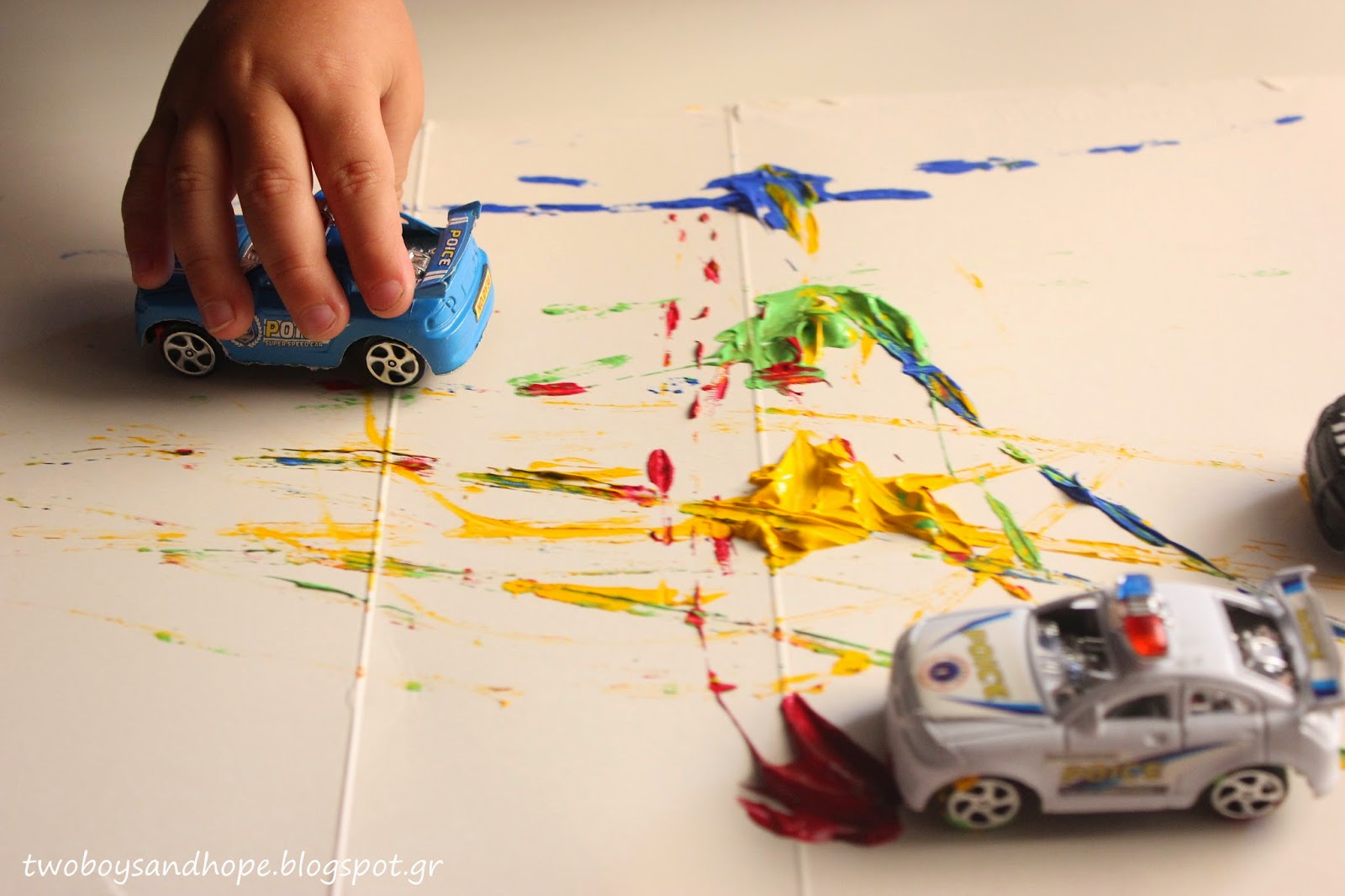 Βάζουμε λίγη μπογιά πάνω στο χαρτί και μετά.. τσουλάμε τα αυτοκινητάκια..
