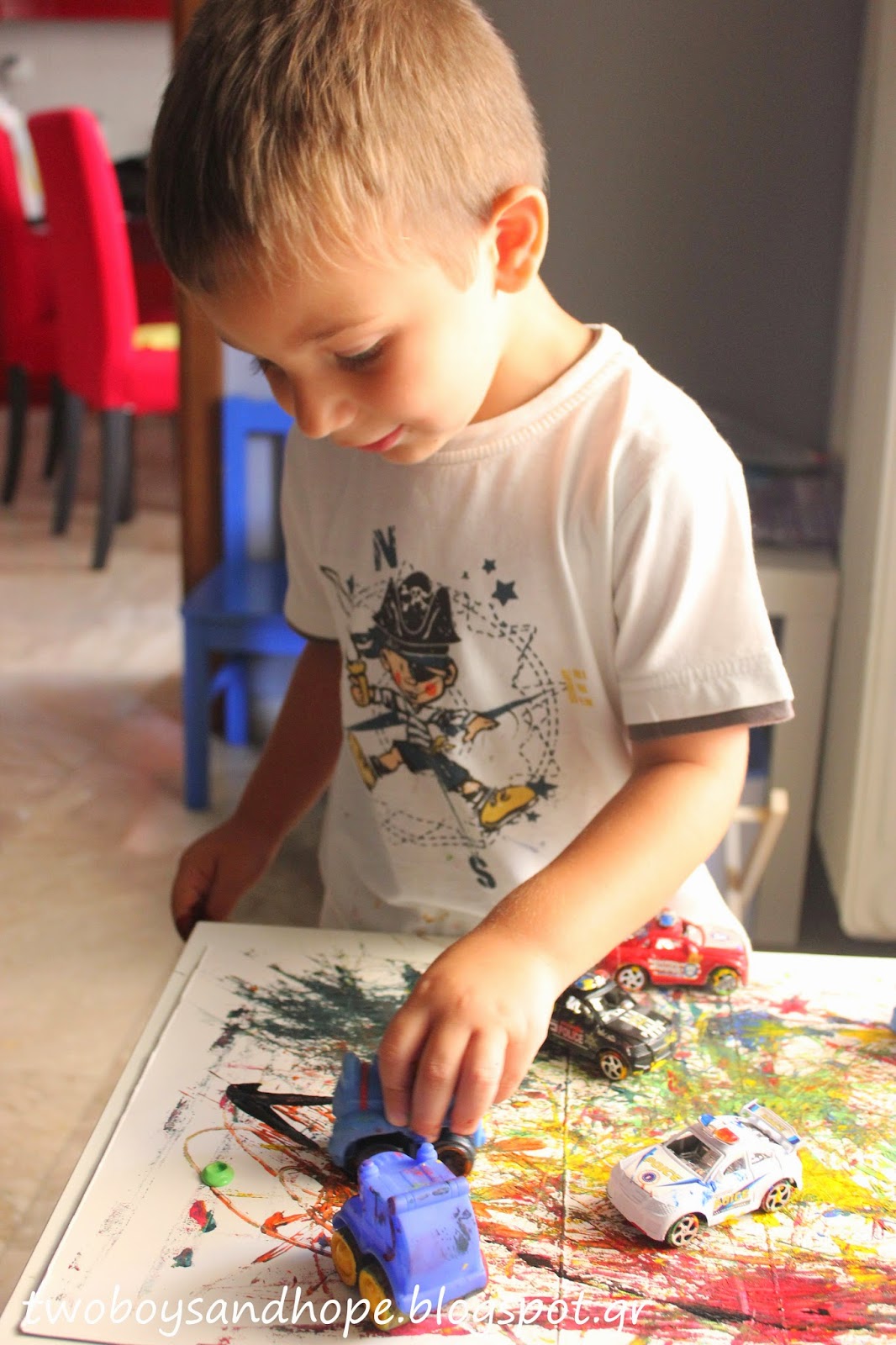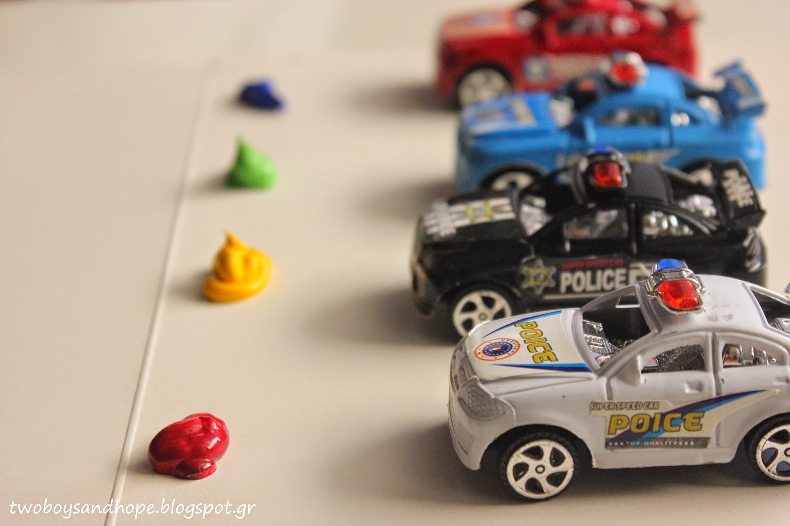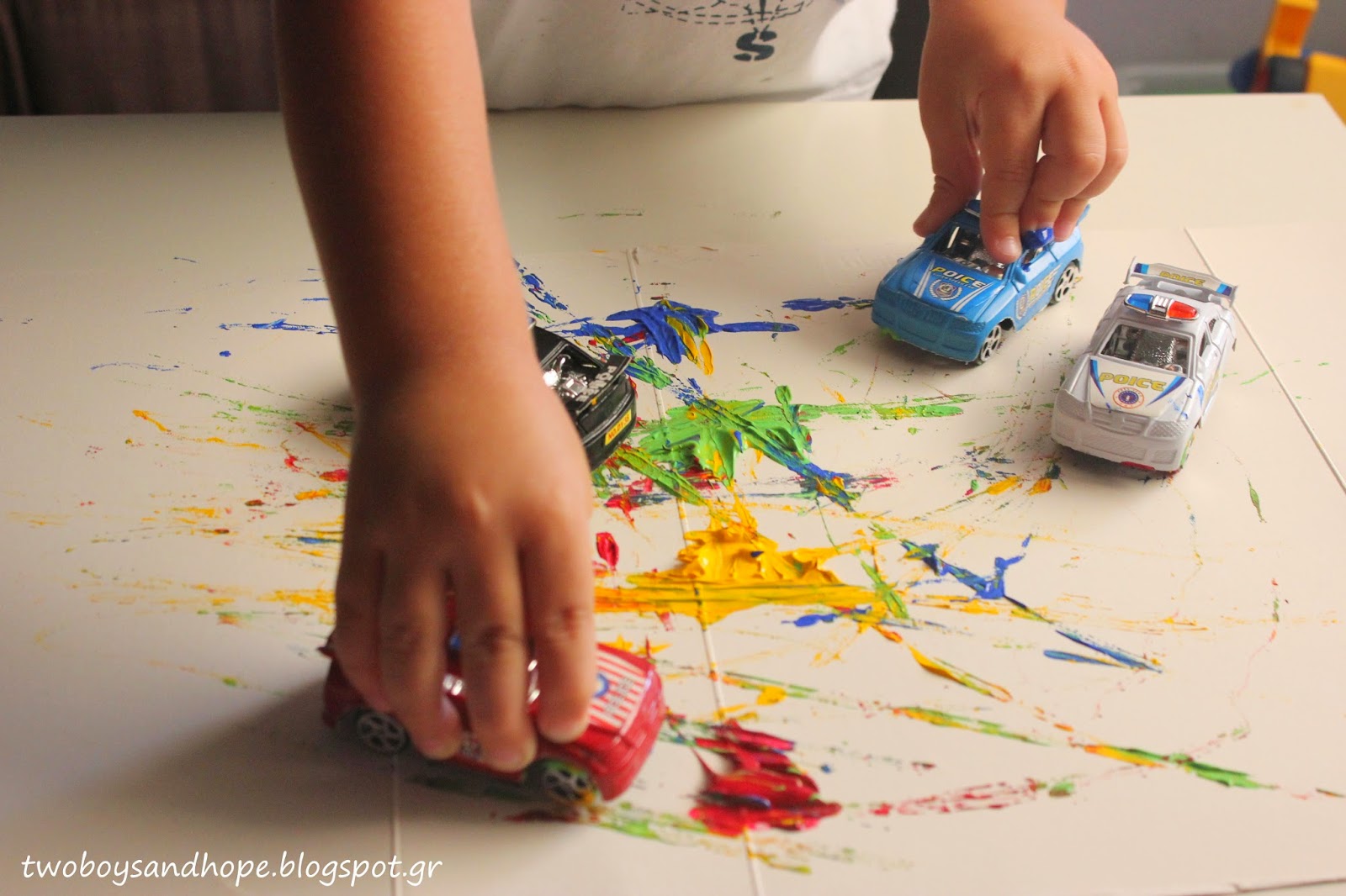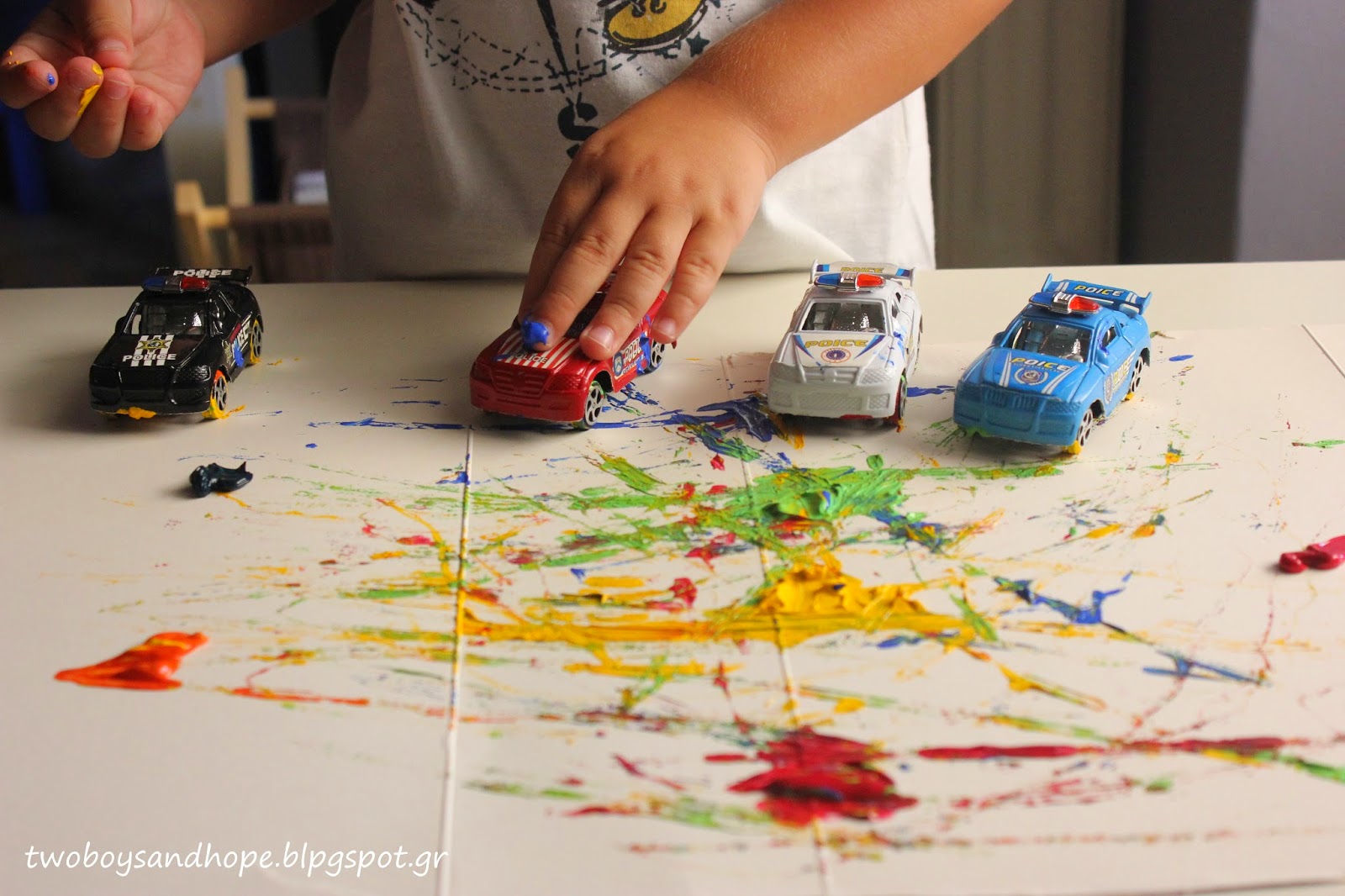 Βάζουμε λίγη μπογιά πάνω στο χαρτί και μετά.. τσουλάμε τα αυτοκινητάκια..