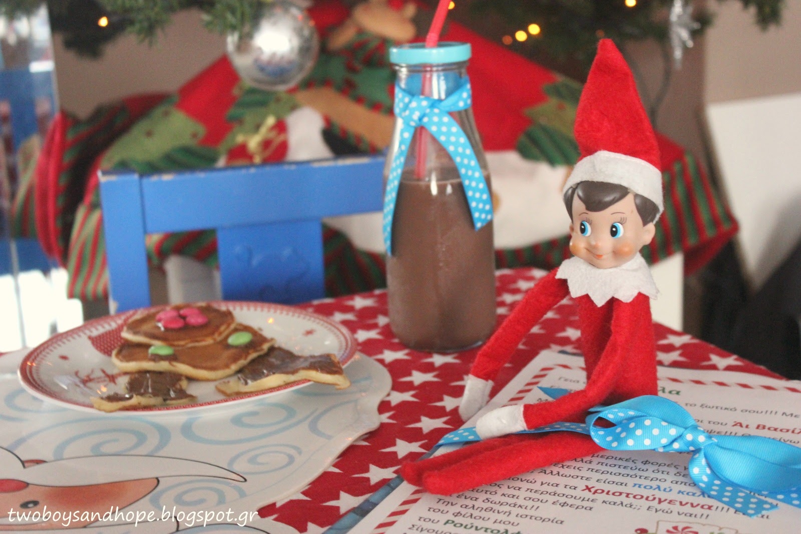 Και εκεί.. κάτω από το δέντρο τον περίμενε μια έκπληξη!! Οι αγαπημένες του ταρανδοτηγανίτες και σοκολατούχο γάλα (μόνο για εξαιρετικές περιπτώσεις στο σπίτι μας) και το ξωτικό του, ο Θανάσης…