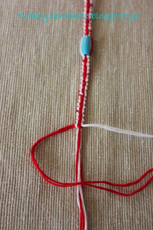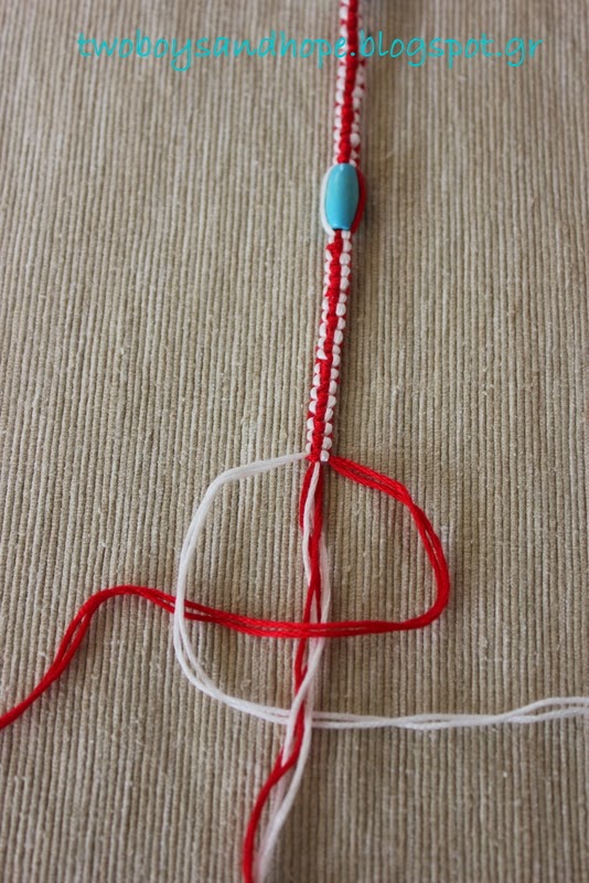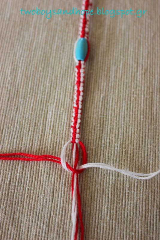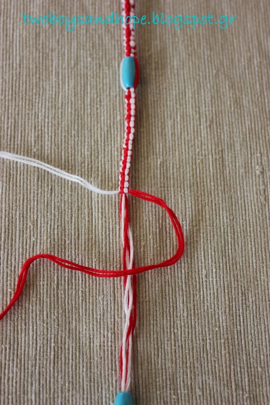 2. Παίρνουμε την άσπρη κλωστή και την περνάμε πάνω από την κόκκινη