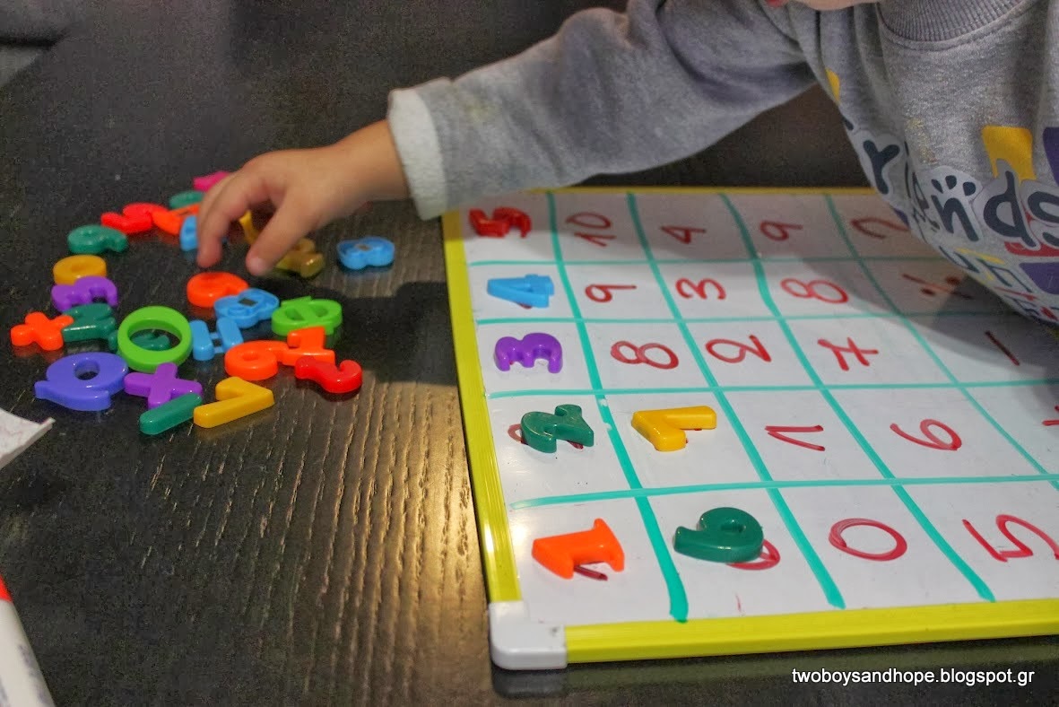 Χρειαζόμαστε μαγνητικούς αριθμούς, ένα ασπροπίνακα μαγνήτη κι ένα μαρκαδόρο για ασπροπίνακα. (Εγώ τα πήρα πολύ πολύ οικονομικά από το Jumbo)